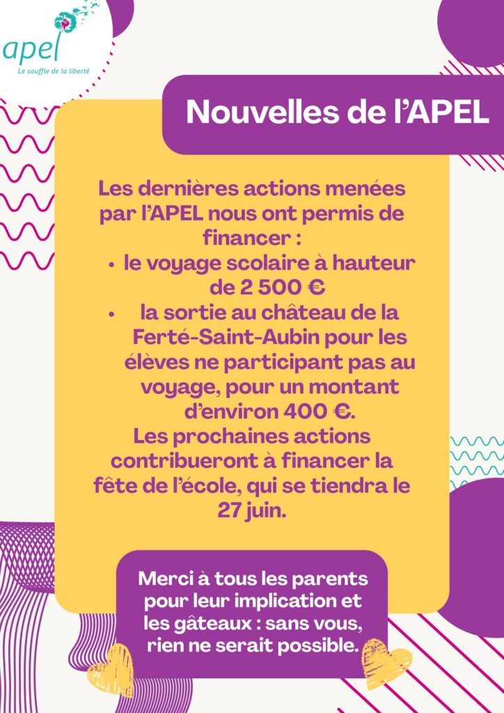 - 🎓 L’APEL Sainte Solange, c’est l’association des parents d’élèves engagés dans la vie de l’école